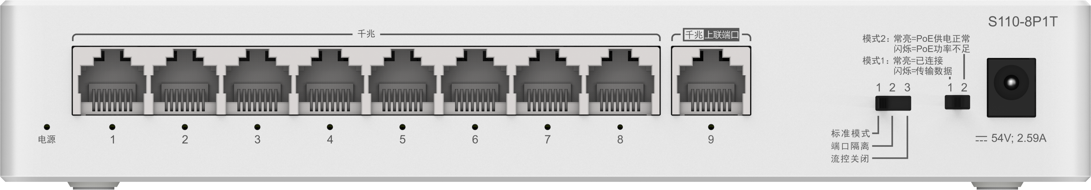 二层|千兆无管理POE交换机|PoE:124W|包转发率13.39Mpps|交换容量18Gbps|9个千兆电|MAC:4K|交流电源|桌面式|静音款|不支持挂耳|国标交流适配器
